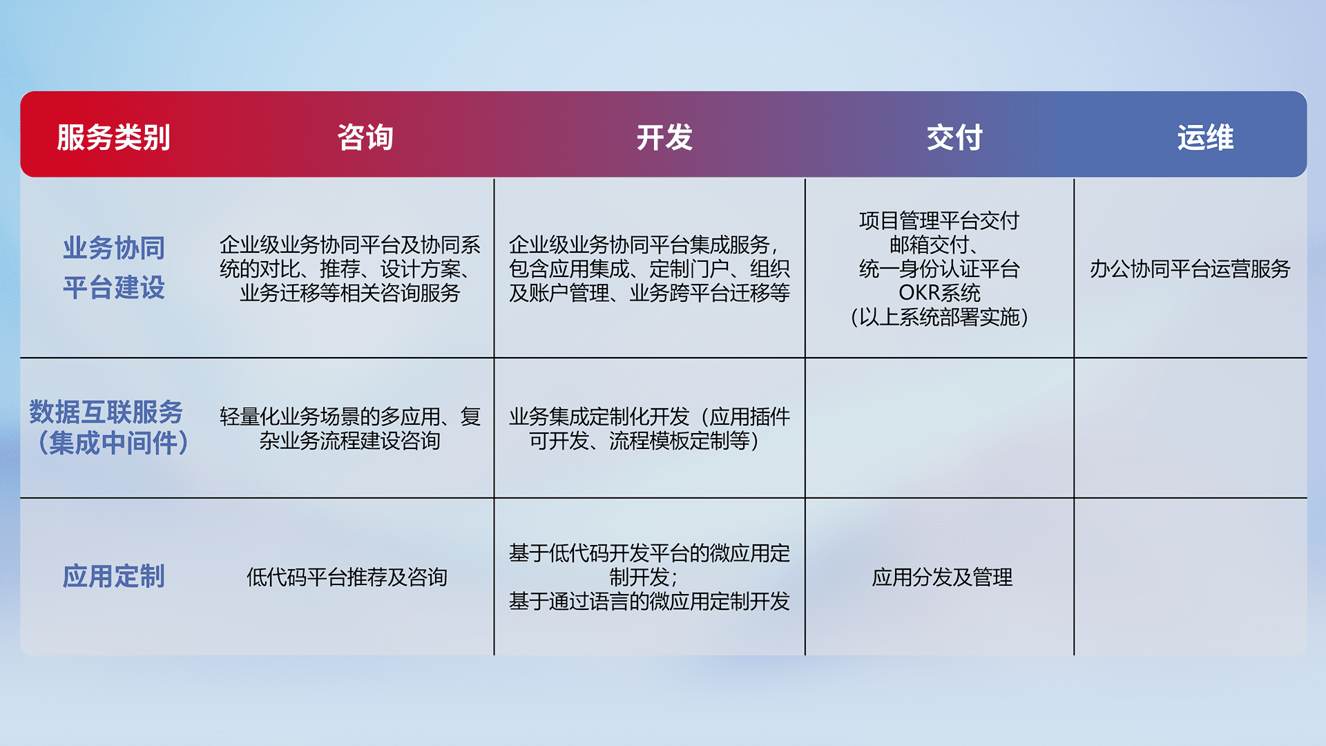 针对钉钉、、、、企微、、IDaas等平台级产品提供产品的规划、、、、方案、、交付、、定制化开发等服务,,,,实现如统一协同办公、、智能客户服务、、混合会议管理、、智能数据查询、、、、等业务场景,,实现数字化转型。。。